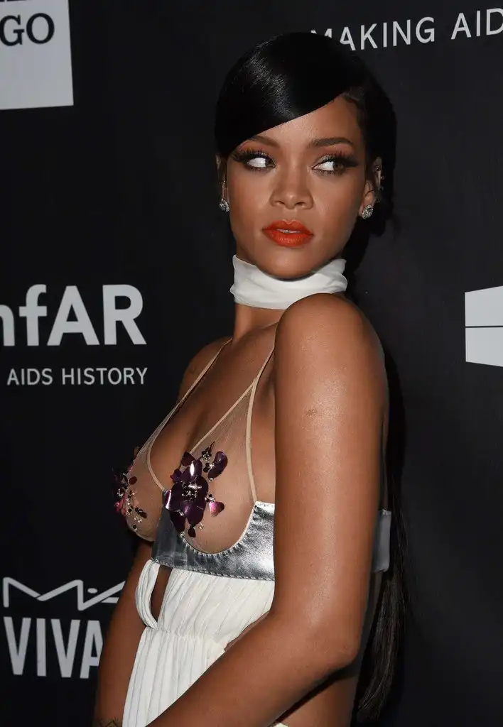 Риане платье мало и это странно. С такими зароботками не подгонять платье... Ну титьки наружу, никого этим уже не удивишь. Скоро вырезы на гениталиях пойдут в ход.