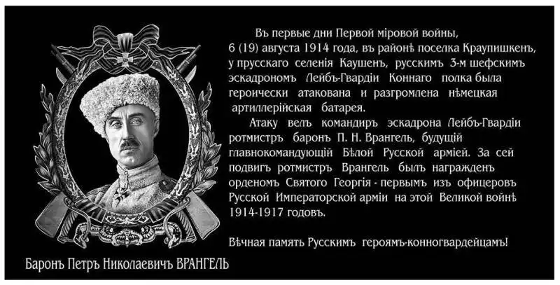 В представлении ротмистра к награждению орденом Св. Георгия было указано: «Стремительно произвел конную атаку и, несмотря на значительные потери, захватил два орудия, причем последним выстрелом одного из орудий под ним была убита лошадь». Так ротмистр барон П.Н. Врангель, представитель цвета русской гвардии, стал первым из офицеров на Первой мировой войне Георгиевским кавалером, о чем гласит запись в дневнике государя императора Николая II от 1914 года: «10-го октября. Пятница. ...После доклада Барка принял Костю, вернувшегося из Осташева, и ротм. Л.-Гв. Конного полка бар. Врангеля, первого Георгиевского кавалера в эту кампанию...»