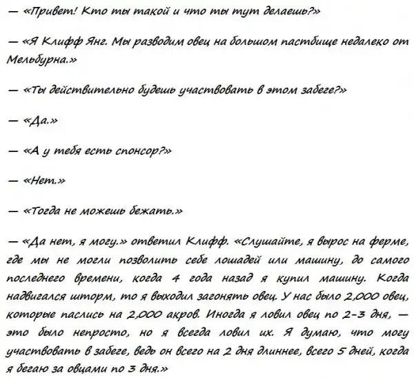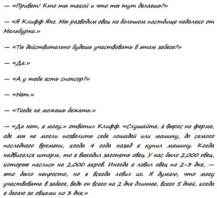 Клифф Янг преодолел забег в 875 километров за 5 дней, 15 часов и 4 минуты. Не зная, что атлеты могут спать, он представлял перед собой убегающую овцу и пытался догнать ее.