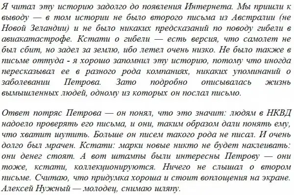 Как многие утверждают нигде в биографиях Петрова об этом увлечении не упоминается. Да и вообще — это просто расхожая легенда. В конце 30-х годов посылать такие письма за границу? НКВД перлюстрировало все письма за границу… После первого возврата все бы решили, что это шифровка.