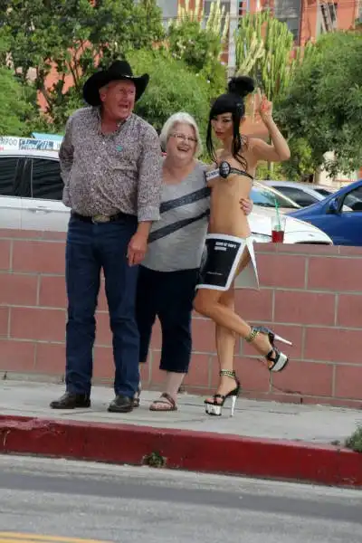 49-летняя актриса Бай Лин в очередной раз не упустила возможности оголиться на публике. На сей раз в откровенном наряде она явилась на церемонию вручения премии The Geekie Awards 2015, однако, перед этим в подобном виде женщина позировала перед камерами на улицах Лос-Анджелеса, удивляя своей выходкой прохожих и автомобилистов.