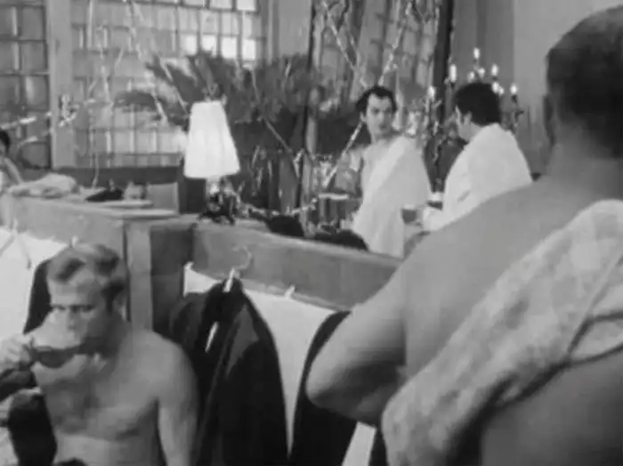Даже скамьи, если верить оператору В. Алисову, были из вестибюля Мосфильма. Из знаменитых Сандунов взяли на прокат только полотенца с простынями, да пальмы.