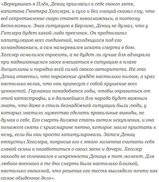 Рейх, май 1945 года. Страна разрушена, война проиграна – такое положение вещей многих в Германии поставило не только на грань выживания, но и на пик переживаний и стресса. Разрушение идеалов последнего десятилетия и боязнь ответственности за содеянное сделали вопрос «а что же будет дальше?» одним из самых главных. Многие из политических, административных и военных функционеров Третьего рейха предпочли по примеру фюрера покончить жизнь самоубийством, ещё большее количество задумывалось об этом универсальном способе решения всех проблем. В подобной ситуации оказался и гросс-адмирал Карл Дениц, ставший преемником Гитлера согласно его завещанию. В своей работе «Режим гросс-адмирала Деница. Капитуляция Германии, 1945» швейцарский историк Марлиз Штайнерт установила, что Дениц тоже не исключал такого варианта для себя: