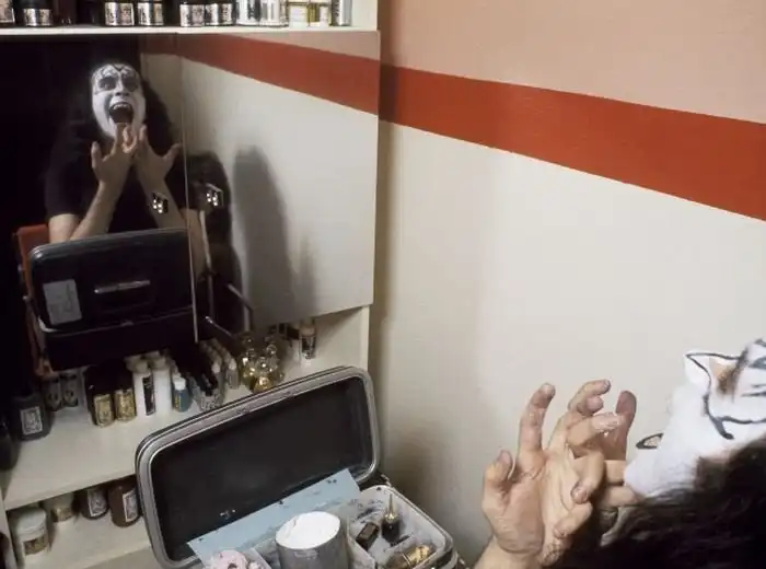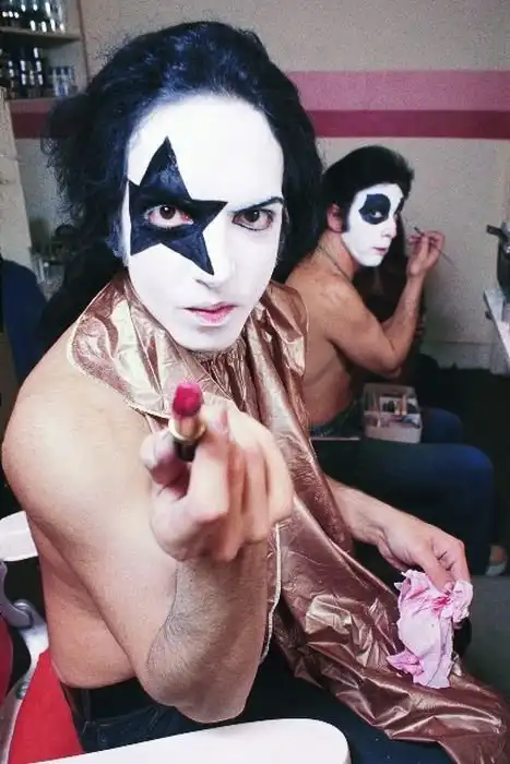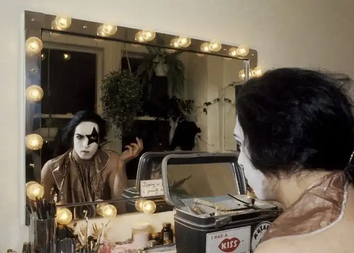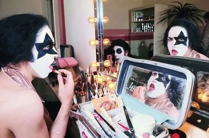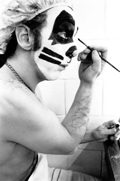 Далее предлагаем взглянуть на редкие кадры, сделанные в гримерке американской рок-группы «Kiss». На этих фото музыканты наносят свой знаменитый грим, без которого не обходилось практически ни одно их выступление в 70-х годах. Каждый участник группы имел свой неповторимый образ, Джин Симмонс выходил на сцену в образе демона, Питер Крисс был котом, Эйс Фрейли называл себя «космическим тузом», а Пол Стэнли выбрал для себя образ «звёздного дитя».
