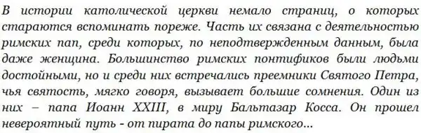 - Современная католическая церковь называет Иоанна XXIII антипапой, обвиняя во всех мыслимых и немыслимых грехах. Возможно, в чем-то описания его похождений и преувеличены, но, несомненно, он был ярким человеком и сильной личностью, да и жить ему пришлось в эпоху, когда святость и порок шли рука об руку.
