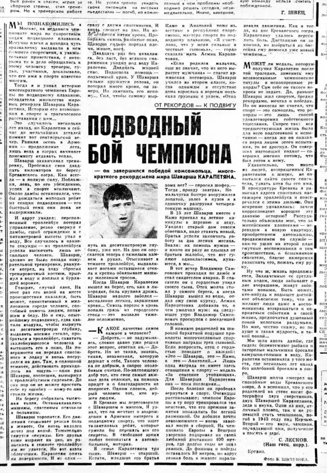 Шаварш Владимирович Карапетян – 11-кратный рекордсмен мира, 17-кратный чемпион мира, 13-кратный чемпион Европы, семикратный чемпион СССР по подводному плаванию.