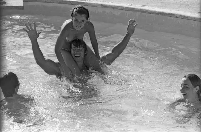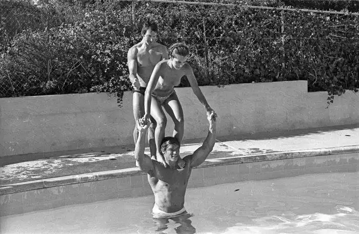 В 76-м на экраны вышел фильм "Оставайся голодным", за роль в котором, Шварценеггеру была вручена награда "Золотой глобус" как самому многообещающему актёру. Фото сделанны в перерыве между съемками. Кроме Арни и начинающей в то время свою карьеру 15-летней Настасье Кински, с ними в басейне резвятся актер Джонни Кроуфорд и Дебра Тейт. Дебра была младшой сестрой актрисы Шерон Тейт - супруги кинорежиссёра Романа Полански, которая в 1969-м, находясь на восьмом с половиной месяце беременности, была зверски убита в собственном доме членами коммуны "Семья" Чарльза Мэнсона.