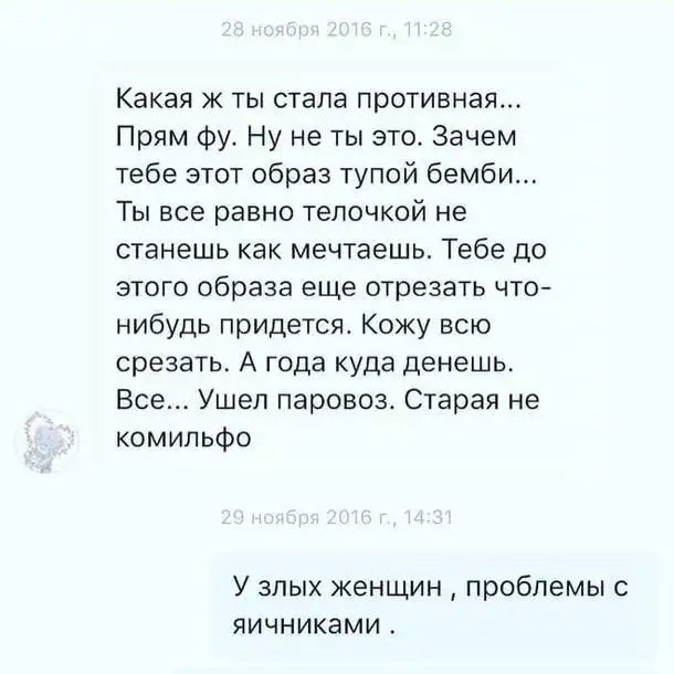 «Вот такие письма приходят мне в Директ))) Вот сижу и думаю, а я ведь и правда телочкой не стану, все напрасно получается? Иду есть сало с тортом запью все пивком заем дрожжами, где мой любимый майонез, хочу хлебаааааа… хочу 150 кг быть потеть не помещаться создавать тень и умереть чуточку раньше))) спасибо, что открыла мне глаза, подружка. А вы товарищи молчали и хвалили меня… стыдно вам должно быть… стыдно!!!»