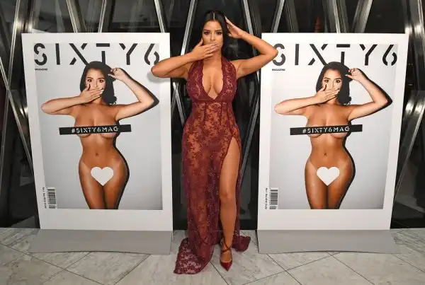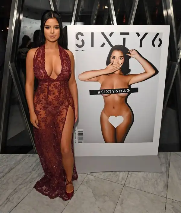 21-летняя британская модель и интернет-звезда Деми Роуз (Demi Rose) в просвечивающемся платье на презентации журнала SIXTY6 в Лондоне.