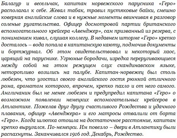 11 марта на глаза «Зееадлеру» после череды парусников наконец попался большой пароход. Как и в самую первую свою охоту, немцы подняли сигнал с просьбой указать время по хронометру. Пароход не отреагировал. Тогда охочий на всевозможные выдумки и импровизации граф приказал запустить приготовленный загодя дымогенератор, изображая пожар. Одновременно были запущены сигнальные ракеты. Англичане прониклись столь драматической картиной и пошли на помощь. Когда пароход «Хорнгарт» подошел поближе, немцы заметили на его корме внушительного размера орудие, которое могло принести деревянному рейдеру крупные неприятности. Надо было действовать решительно, а главное, быстро. Расстояние между кораблями уменьшалось, «пожар» был внезапно взят под контроль. На палубе появился специально наряженный женщиной матрос, приветливо махавший приближавшемуся пароходу. Пока англичане хлопали глазами, фальшборт опустился, и на пароход нацелилось жерло 105-мм орудия, одновременно был поднят германский флаг. Капитан «Хорнгарта» тоже был не из робкого десятка и отказался капитулировать – прислуга побежала к орудию. Но Люкнеру и его плавучей театральной труппе противостоять было нелегко. На палубу «Зееадлера» выскочила абордажная команда с тесаками и винтовками. Для солидности тут же сноровисто установили пулемет. Пока с борта «Хорнгарта» смотрели, как на мрачном паруснике суетятся какие-то недоброго вида бородачи, подозрительно похожие на подельников капитана Флинта и Билли Бонса, с рейдера выстрелила специальная шумовая пушка, изготовленная из трубы и набитая порохом. Раздался ужасный грохот, одновременно немцы выстрели и из настоящего орудия – снаряд снес антенну радиостанции. Кульминацией спектакля стал одновременный рев трех человек в мегафоны: «Приготовить торпеды!» Такому напору, такой экспрессии было невозможно противостоять – суматоха на пароходе улеглась, и англичане замахали белыми тряпками. Забрав со строптивого парохода несколько музыкальных инструментов, в том числе пианино для кают-компании, немцы отправили его в рейс к Нептуну.
