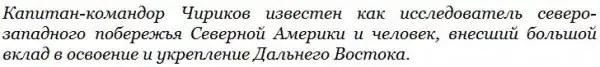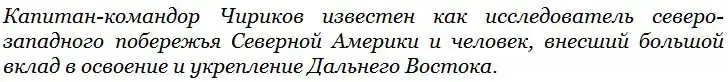 «Капитан Алексей Ильич Чириков был лучшим офицером своего времени, краса и надежда флота, умный, образованный, скромный и твердый, человек», - такую характеристику ему дал Александр Соколов, историк, живший в XIX веке.