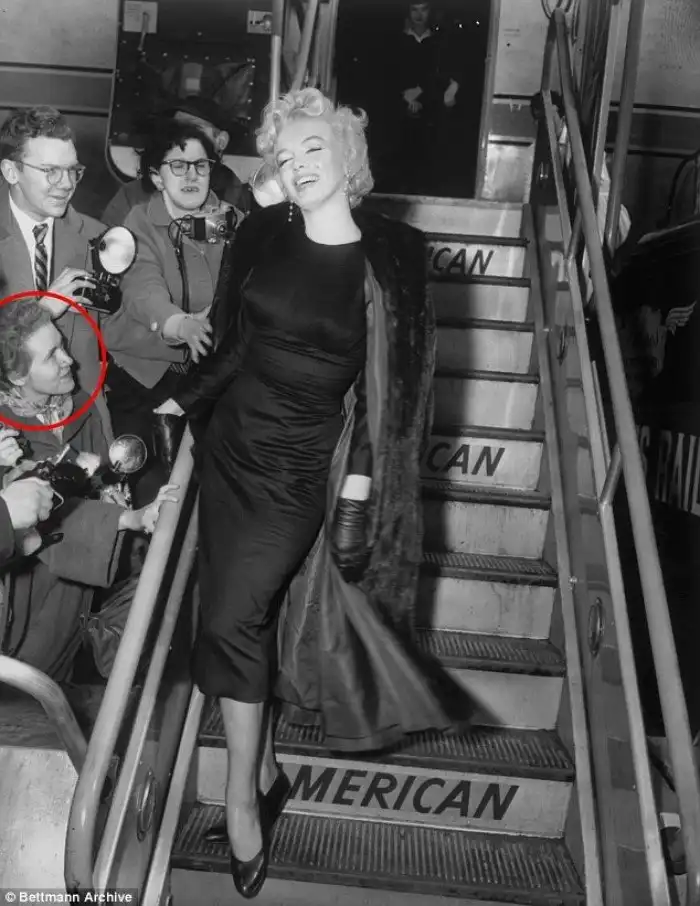 На этом снимке Фрида Халл (в кружке), стоя среди журналистов, с обожанием смотрит на Мэрилин. Фрида обожала ее еще с детства, когда вместе с другими фанатками буквально преследовала актрису. По словам Фриды, Монро всегда по-доброму относилась к таким девчонкам, как она. Впоследствии работа в авиакомпании PanAm дала ей шанс лично познакомиться и даже подружиться со своим кумиром.