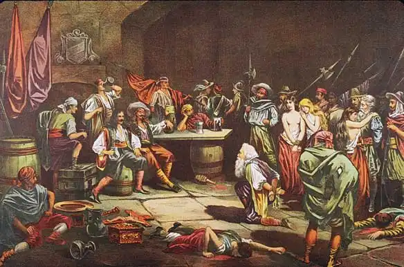 «На следующий день пираты стали обшаривать и грабить городские дома; при этом они допытывались у пленных, кто в городе богаче всех. Пленники им это сказали, и пираты схватили богачей, чтобы дознаться, куда они дели свое добро. Всех, кто упорствовал и не желал по доброй воле признаваться, тащили на дыбу и терзали, пока он не отдавал богу душу или не показывал все, что от него требовалось».