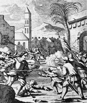 Хотя пираты и бросились на штурм, однако взять баррикады было гораздо труднее, чем драться в чистом поле, потому что пушки стреляли картечью и наносили куда больший урон, чем мушкеты в только что выигранном бою. Однако, несмотря на все это, спустя два часа город был в руках пиратов, и они перебили всех, кто им сопротивлялся»
