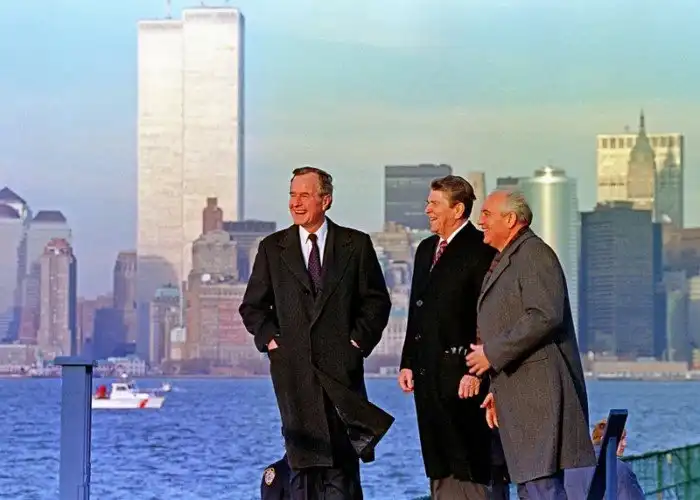 Президенты Буш, Рейган и Горбачёв на Манхэттене. Башни близнецы ещё стоят. СССР тоже ещё пока. США, 1988 год.