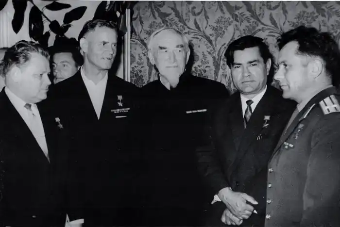 Герои Советского Союза Павел Попович, Захар Сорокин, Алексей Маресьев, Сергей Курзенков и «дедушка русской авиации» Борис Россинский