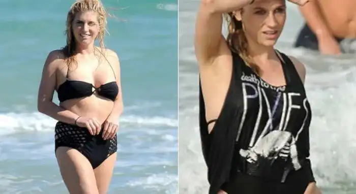 Певица пережила множество взлетов и падений: изнасилование, лечение нервной булимии, судебное разбирательство с продюсером. Кажется, раздельный купальник Кеша позаимствовала у своей бабушки. Наряд подчеркивает недостатки и даже уродует фигуру. Второй вариант куда лучше.
