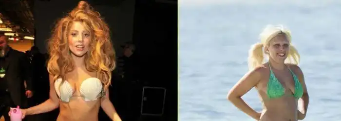 На одной из ежегодных премий MTV Video Music Awards Гага появилась в образе очаровательной русалки. Кто бы мог подумать, что в реальной жизни певица далека от того образа: лишние килограммы, небрежная прическа, осветленные брови и неудачный купальник.