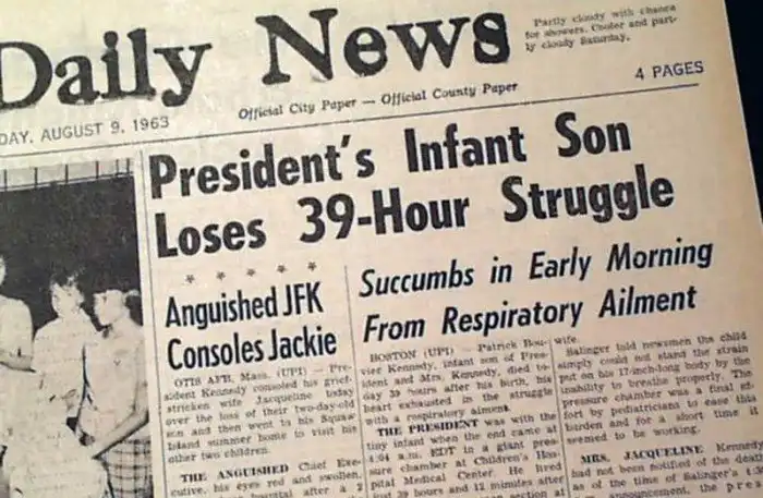 У президента Джона Кеннеди и его жены Жаклин были проблемы с рождением детей. В 1955 году у Жаклин случился выкидыш, в 1956-м она родила мертвого ребенка. Затем последовали две удачных беременности. В 1963 году она была беременна в третий раз. Однако беременность вновь прошла неудачно. Мальчик, Патрик Бувьер Кеннеди, родился в августе 1963-го, на три недели раньше срока и умер спустя двое суток от дыхательной недостаточности.