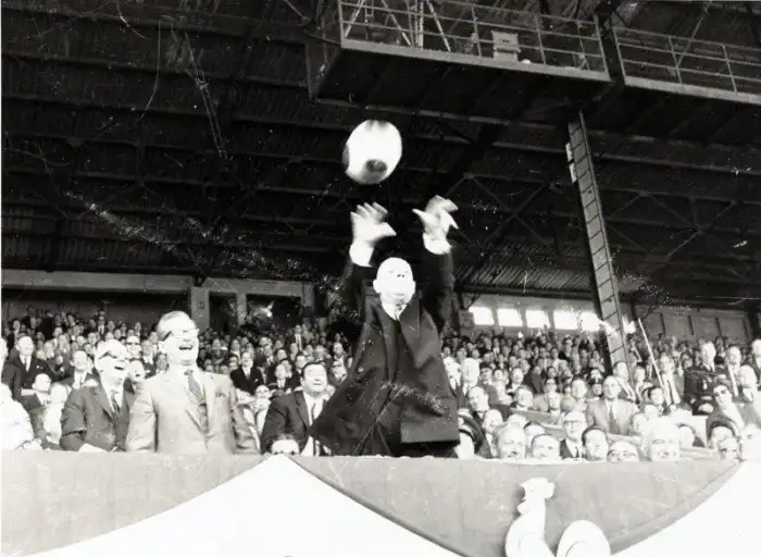 Шарль Де Голль возвращает прилетевший с поля мяч в финале Кубка Франции по футболу 1967 года между «Лионом» и «Сошо». Смех окружающих вызвала фраза президента «В этой стране я действительно всё должен делать сам».
