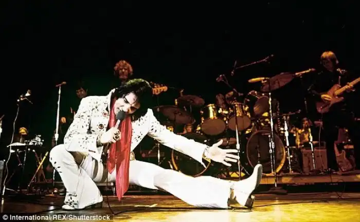 Элвис во время выступления в 1976 году, за год до смерти. На нем знаменитый костюм со стразами