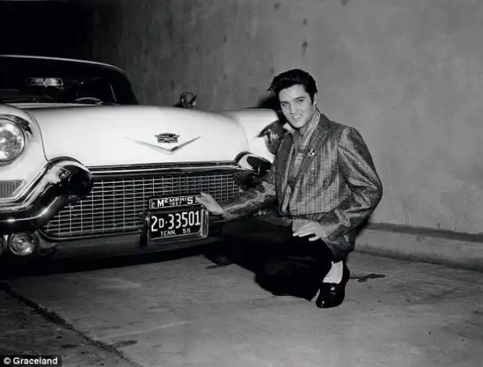 Элвис на фоне своего имения Грейсленд, 1957 год