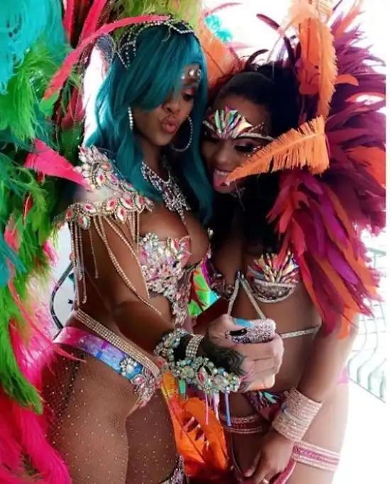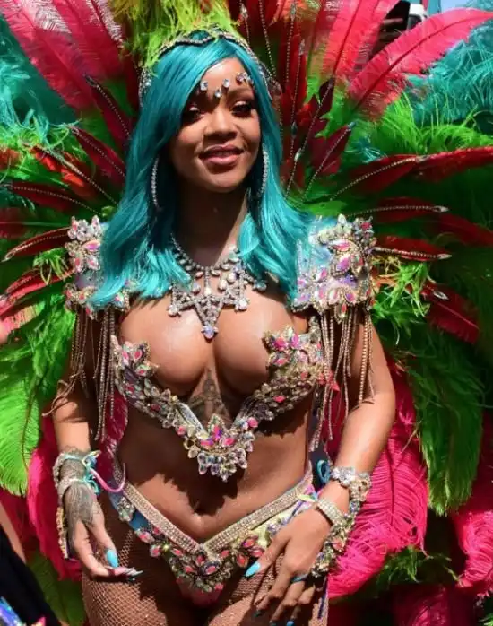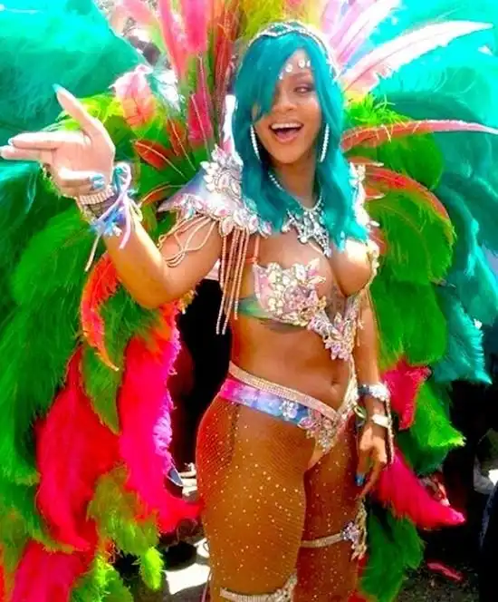 Американская певица Рианна опубликовала на своей странице в Instagram фотографии с фестиваля Crop Over, который прошел на ее Родине - острове Барбадос. 29-летняя звезда регулярно принимает участие в этом фестивале, посвященном сбору урожая. Для участия в традиционном мероприятии, берущем свое начало в XVII веке, певица выбрала откровенный наряд с декоративным бикини и яркими перьями. Ее образ дополняли колготки в сетку, стразы на лице и бирюзовые волосы. Судя по опубликованным фото, девушка отлично провела время.