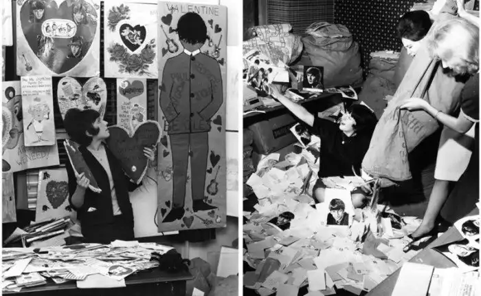 Слева: секретарь фан-клуба "Битлов" с сотнями валентинок, отправленными парням, 1964. Справа: сотрудники фан-клуба в Лондоне опустошают один из множества мешков с фан-почтой, 1963