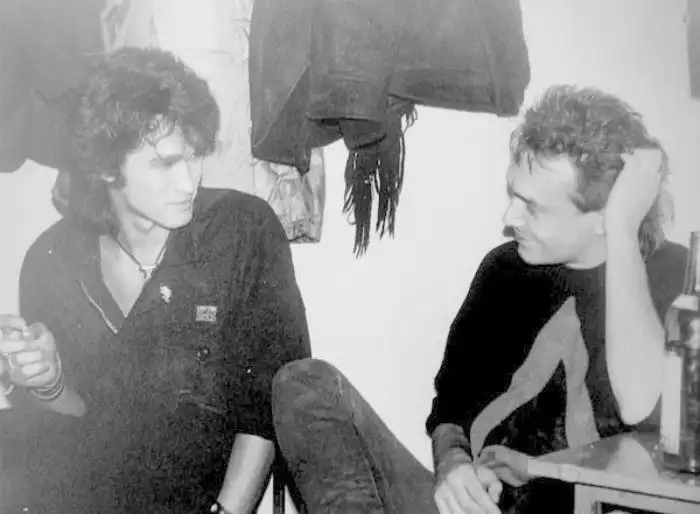 Виктор Цой и Константин Кинчев в гримёрке СКК (Ленинград), 1988 год