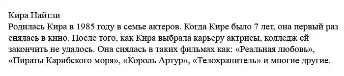 6. Кира Найтли / Keira Knightley (род. 26 марта 1985, Лондон) - британская актриса. Её роли:"Доктор Живаго", "Играй как Бекхэм", "Пираты Карибского моря: Проклятие Чёрной жемчужины", "Реальная любовь", "Король Артур", "Пиджак", "Домино", "Гордость и предубеждения", "Анна Каренина", "Джек Райан", "Нетронутая" и др.