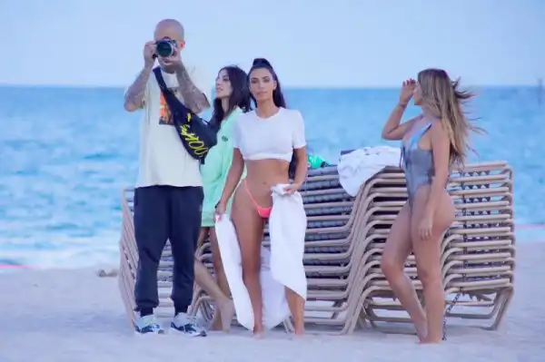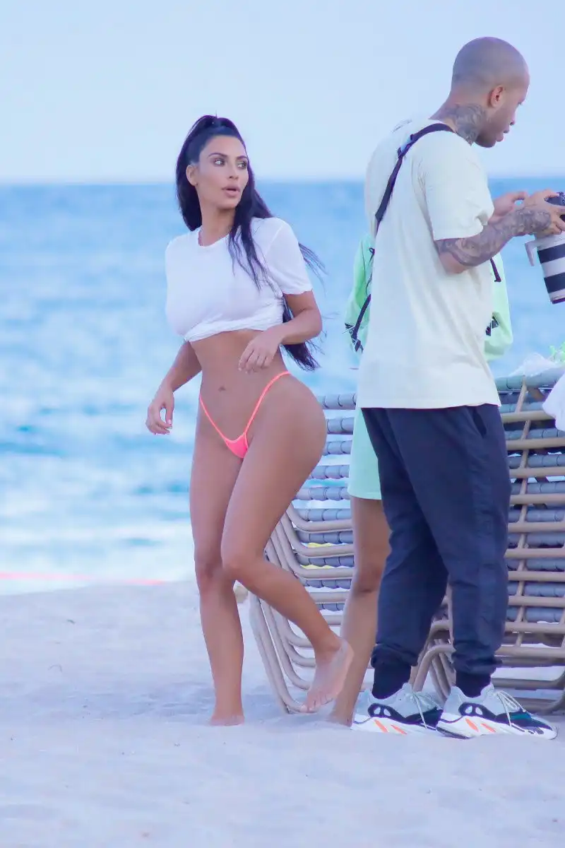 37-летняя американская звезда реалити-шоу, актриса и фотомодель Ким Кардашян (Kim Kardashian) в стрингах и белой маечке позирует на пляже в Майами.