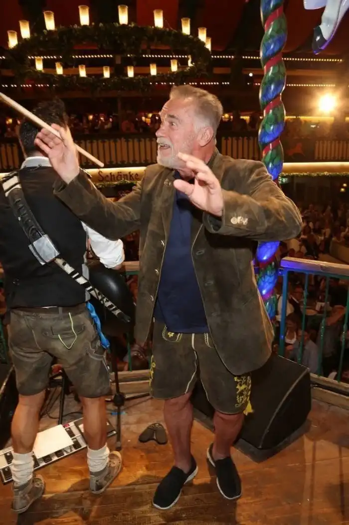 На одном из снимков Шварценеггер держит большую кружку пива. Рядом с ним — его сын. Оба одеты в традиционные баварские кожаные шорты ледерхозе и шляпы. Хизер Маллиган, подруга актера и физиотерапевт, тоже нарядилась в народный костюм.