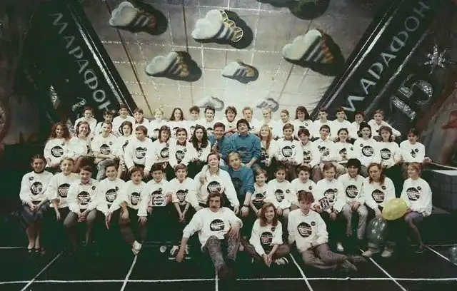 «Это фото было сделано на итоговой программе 1989 г. Для себя мы ее называли «золотая пятнашка». Ниже нас с Сергеем — Светлана Прудовская и Николай Светлаев, на полу — наш многолетний оператор и друг Эдуард Мазуро. Вокруг нас дети со всего Союза — победители викторин и конкурсов «Марафона-15»