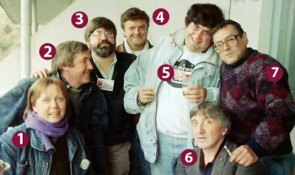 «Марафон-15» в «Артеке» (1990): Светлана Прудовская (1), Лев Гущин (2) — тогда первый зам. главного редактора журнала «Огонек», шеф бюро журнала Time Джон Кохан (3), Сергей Супонев (4), Георгий Галустьян (5), публицист и народный депутат Юрий Щекочихин (6) и начальник отдела «марафонцев» Михаил Шилов (7).