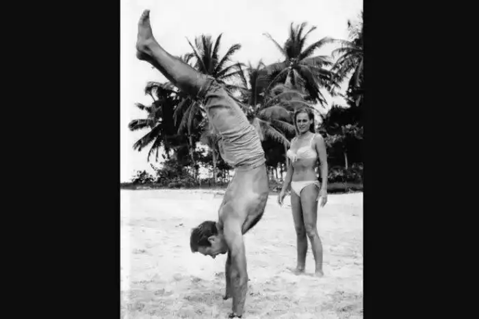 2. Бонд... Джеймс Бонд: Шон Коннери пытается произвести впечатление на Урсулу Андресс, делая стойку на руках. Фотография была сделана на съемочной площадке «Доктора Ноу"