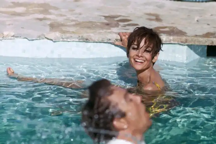 Одри Хепберн смеется в бассейне, купаясь с английским актером Альбертом Финни, 1966