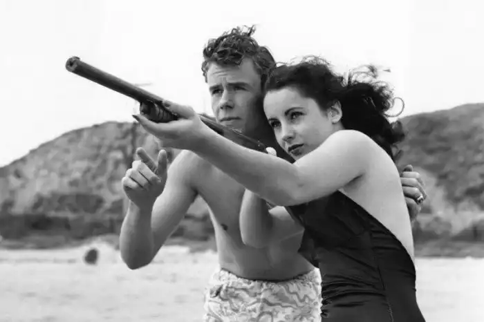 Элизабет Тейлор, проверяющая свою меткость на пляже, примерно 1948 год