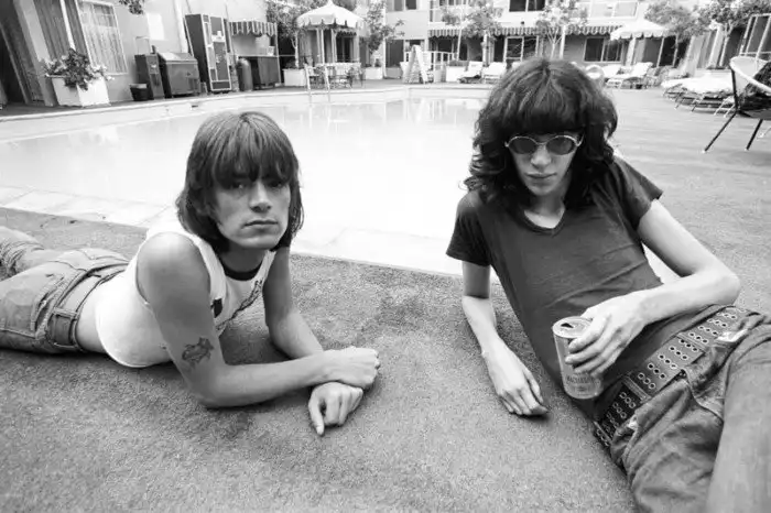 Панк-рок-группа Ramones, выбравшая для отдыха возле бассейна джинсы и пиво, 1977