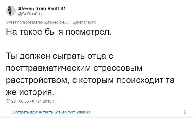 А один парень вспомнил, что старина Джо Пеши, как раз недавно снял в фильме Скорсезе "Ирландец". Так что зачем искать новых актеров, если есть 76-летний Пеши и 38-летний Калкин? Может получиться отличный сиквел.
