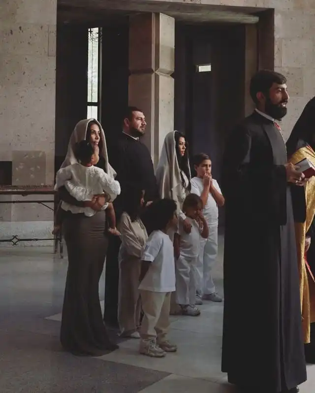 Крещение приняли не только трое младших детей Ким Кардашьян, но и сама модель, а также ее сестра Кортни с детьми. Крестным отцом сестёр и их шестерых детей стал 27-летний диакон Наири Срапионян, местный священнослужитель.
