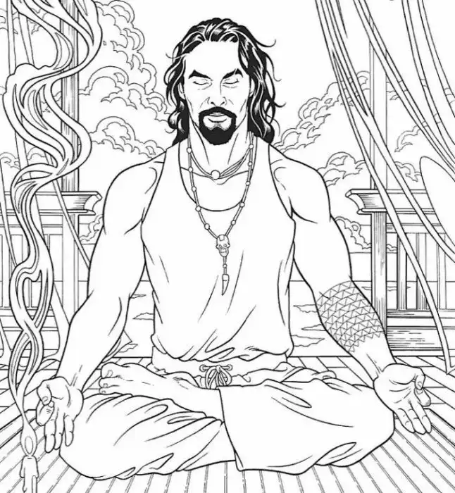"Влюбляйся и раскрашивай: Джейсон Момоа. Фантазийная книжка-раскраска," - гласит название творения. Внутри книжки - 35 контурных рисунков с участием актера в самых разных сценах: он медитирует, плавает на корабле, выгуливает собак, колит дрова.