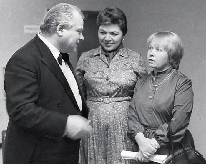 Композитор Тихон Хренников, певица Майя Кристалинская и композитор Александра Пахмутова в Государственном Центральном Концертном зале "Россия". 30 января 1982 года. Фото Владимира Савостьянова /Фотохроника ТАСС/