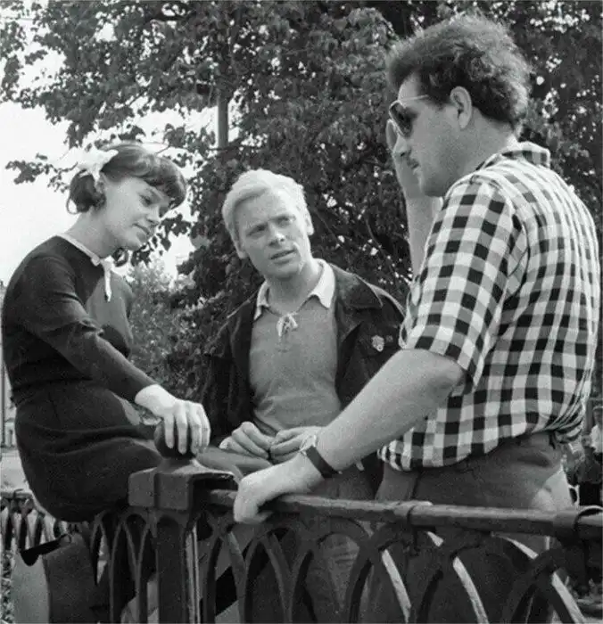Нина Дробышева, Виталий Коняев и Григорий Чухрай на съемках фильма "Чистое небо". 12 сентября 1960 года. Фото Галины Кмит / РИА Новости