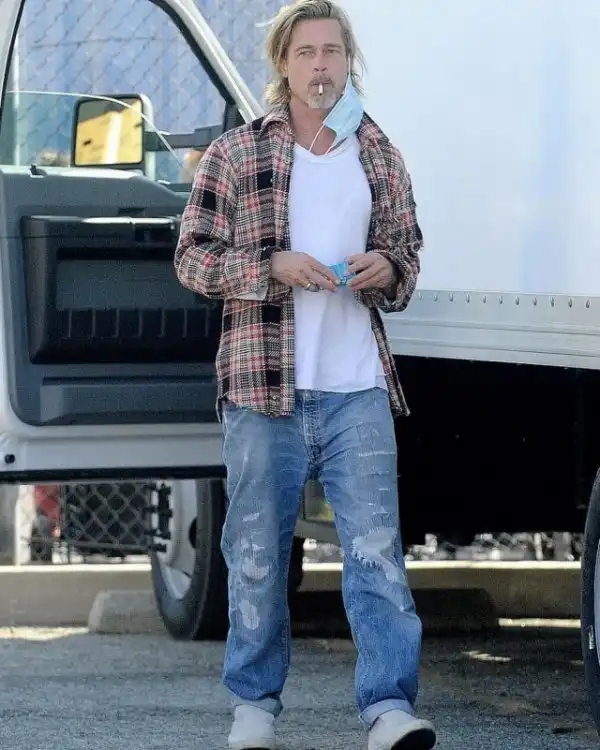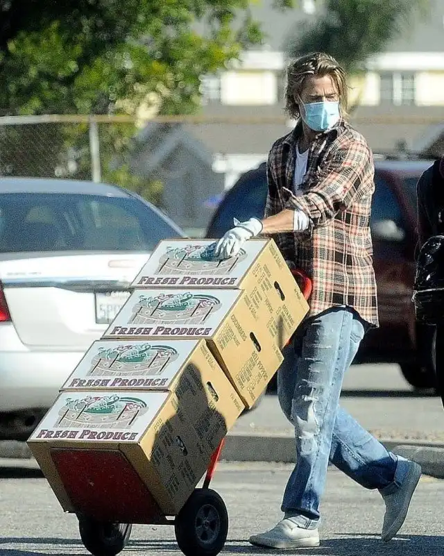 Брэд Питт приехал к попавшим в сложную ситуацию из-за эпидемии людям на грузовике и привез ящики с продуктами. Целый час он разгружал коробки, но маску и очки не снимал.