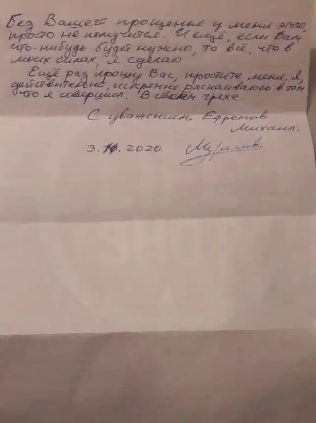 Актер отбывает наказание, но, как он сам несколько раз признавался, тяжело переживает содеянное. Он решил изложить свои мысли на бумаге и попросил отправить их семье погибшего Захарова. Адвокат потерпевших уже заявил: "Это те слова, которые нужно было говорить изначально".