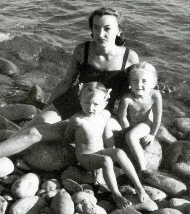 Лидия Вертинская со своими маленькими дочерьми Марианной и Анастасией. Пляж, скажу я вам, несколько каменистый.