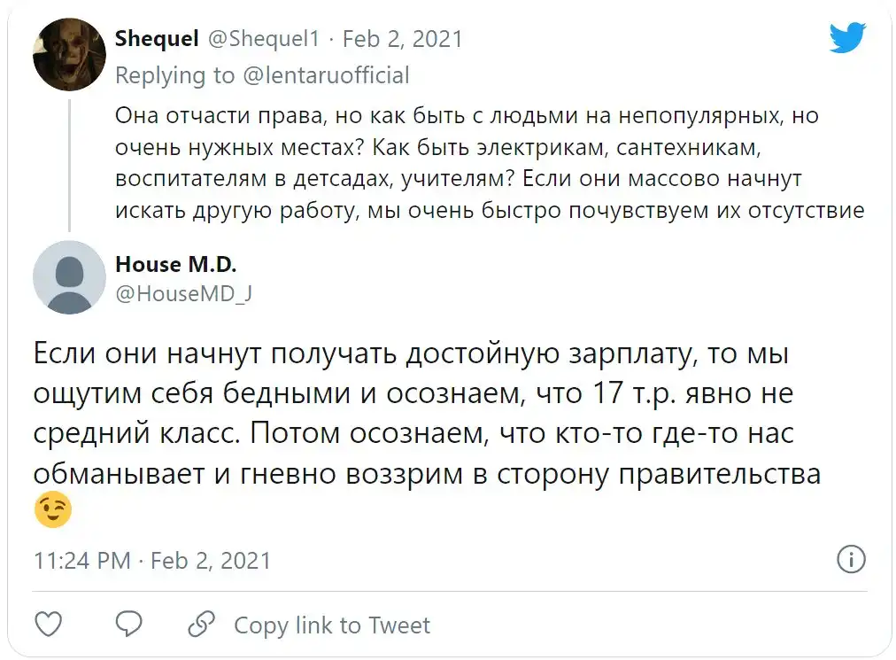 "Да вы не виноваты. Но и люди не виноваты что достойные специальности оплачиваются очень низко.. Люди учатся, работают и стремятся. Но их труд не ценится. Из за этого люди недовольны, а не из за того что они бездельники. Надо зарплату ваших коллег и вашу платить врачам, учителям и т. п. А вам то что они получают... Тогда по другому будете говорить", - @seatu93
