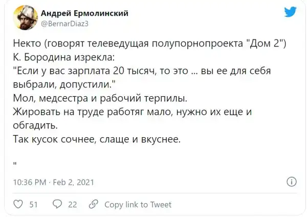 "Ну работает человек, на 2,трех работах а зарплата все равно ниже среднего. Дело не в том что ты работаешь или нет, а дело в не справедливости! Люди которые работают сутками, спасают человеческие жизни получают копейки, а те которые своими жоп@ми крутят,снимаются в дурацких реалити шоу,поют под фонограмму, по телевизору зарабатывают миллионы! Как так то!" @- @ann233298