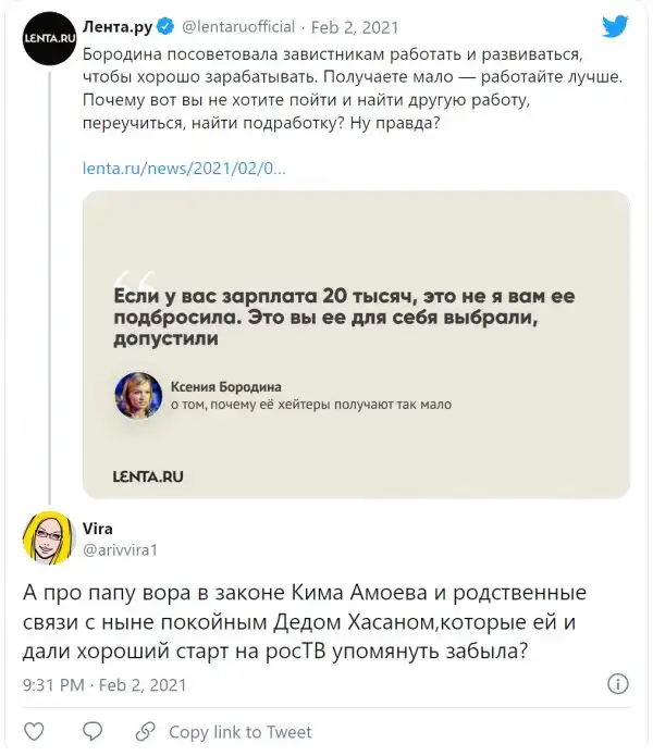 "Интеллект полевой мыши": Бородина разозлила соцсети, заявив, что в низкой зарплате россияне виноваты сами