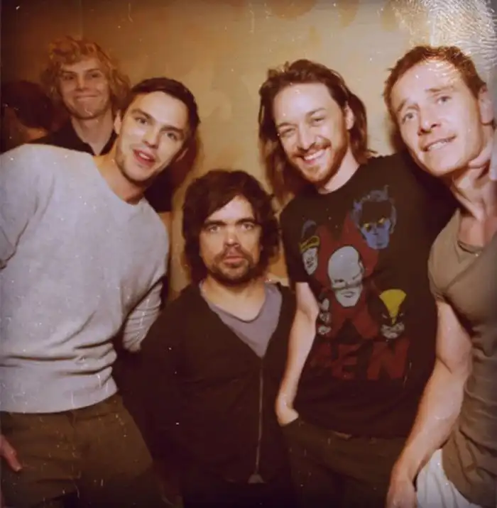 3. Эван Питерс, Николас Холт, Питер Динклейдж, Джеймс МакЭвой и Майкл Фассбендер на съёмках фильма «Люди Икс: Дни минувшего будущего»